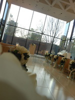 一緒にガーデンから入場と見せかけて・・・・トイレにいってくるとぬけたたかひろさん。さりげなく会場内にはいり、ピアノの前にスタンバイしました。そしてガーデンにいるちひろさんに少し言葉をかけたのち、たかひろさんのピアノ生演奏の中、ちひろさんの入場です!ちひろさんは入場のときから、涙、涙、涙でしたね。ピアノ演奏のあとは、お花屋さんとこっそり打ち合わせをしたブーケをプレゼント!たかひろさん、しっかりイメージが形になりました!よかったですね!大成功!