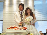 大きなショートケーキにおふたりのマジパンがのった世界にたった一つのウエディングケーキ!