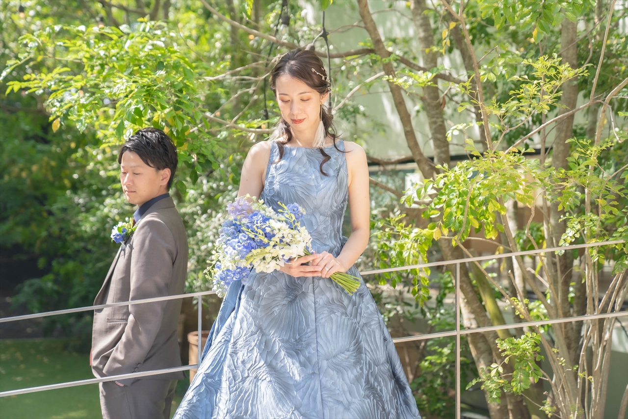 かなこさんの好きなブルーの花束を持った たくみさんの姿が