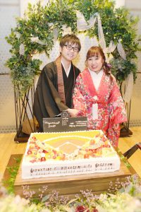 ピアノとサックスが乗った 克奈さんらしい世界でたった一つのウエディングケーキに入刀し