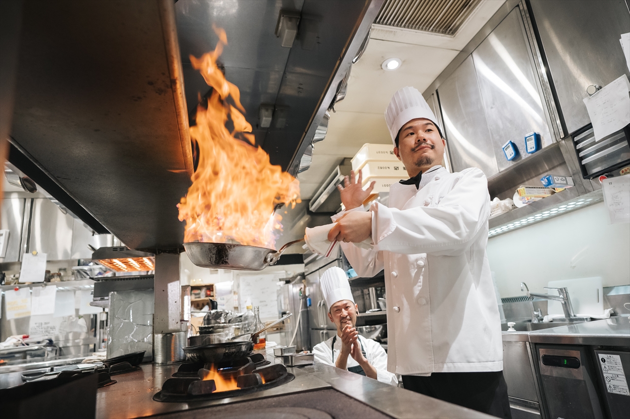 オープンキッチンではもときさんからのフランベパフォーマンス🔥