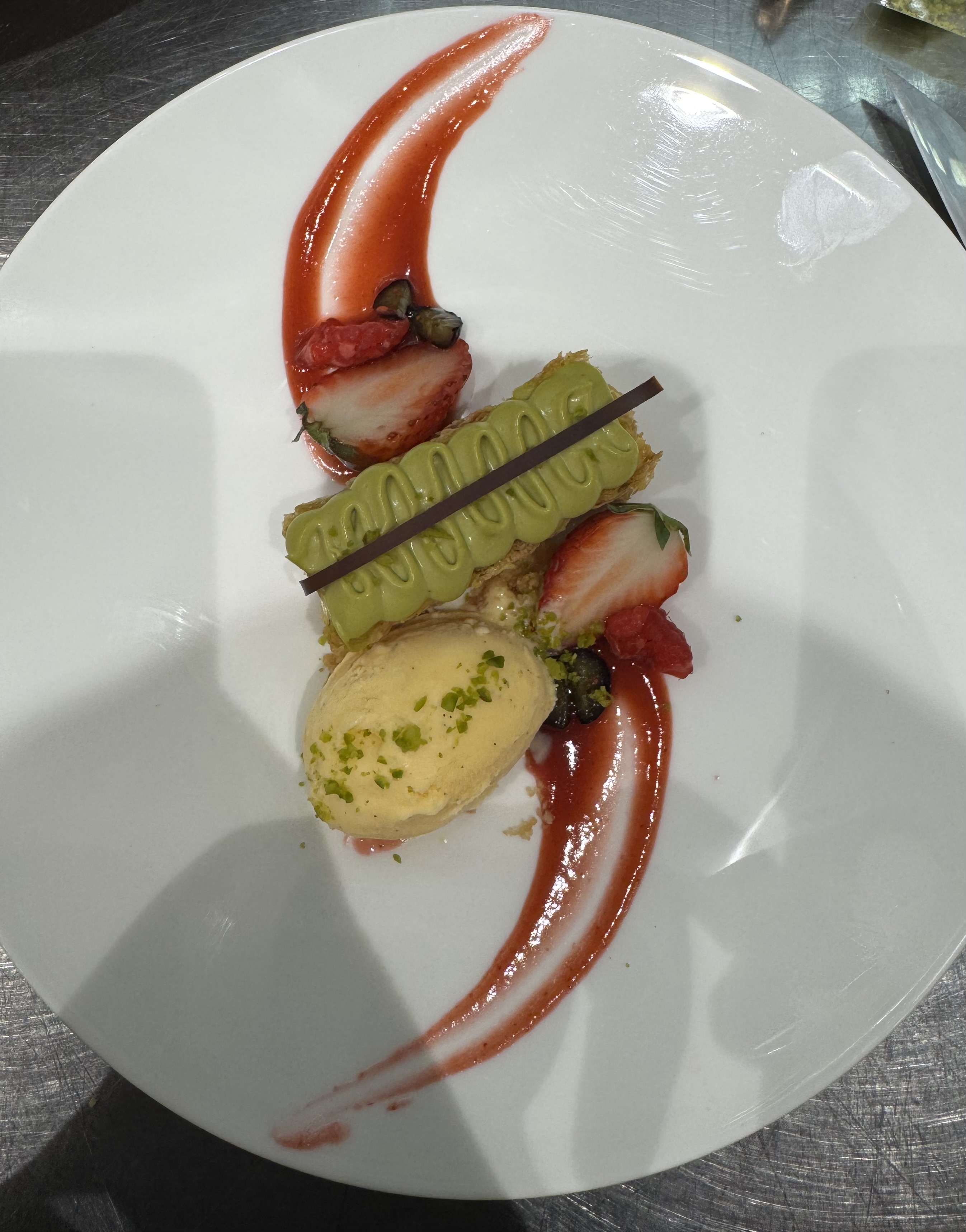 オレンジカスタードのミルフィーユに、コクのあるピスタチオクリームを合わせたデザートを作りました。